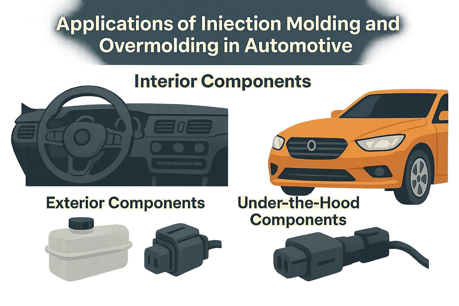 Le moulage par injection et le surmoulage sont une partie cruciale du paysage de fabrication automobile. Ils permettent la création de composants complexes, légers et durables à travers les systèmes intérieurs, extérieurs et sous le capuchés d'un véhicule.