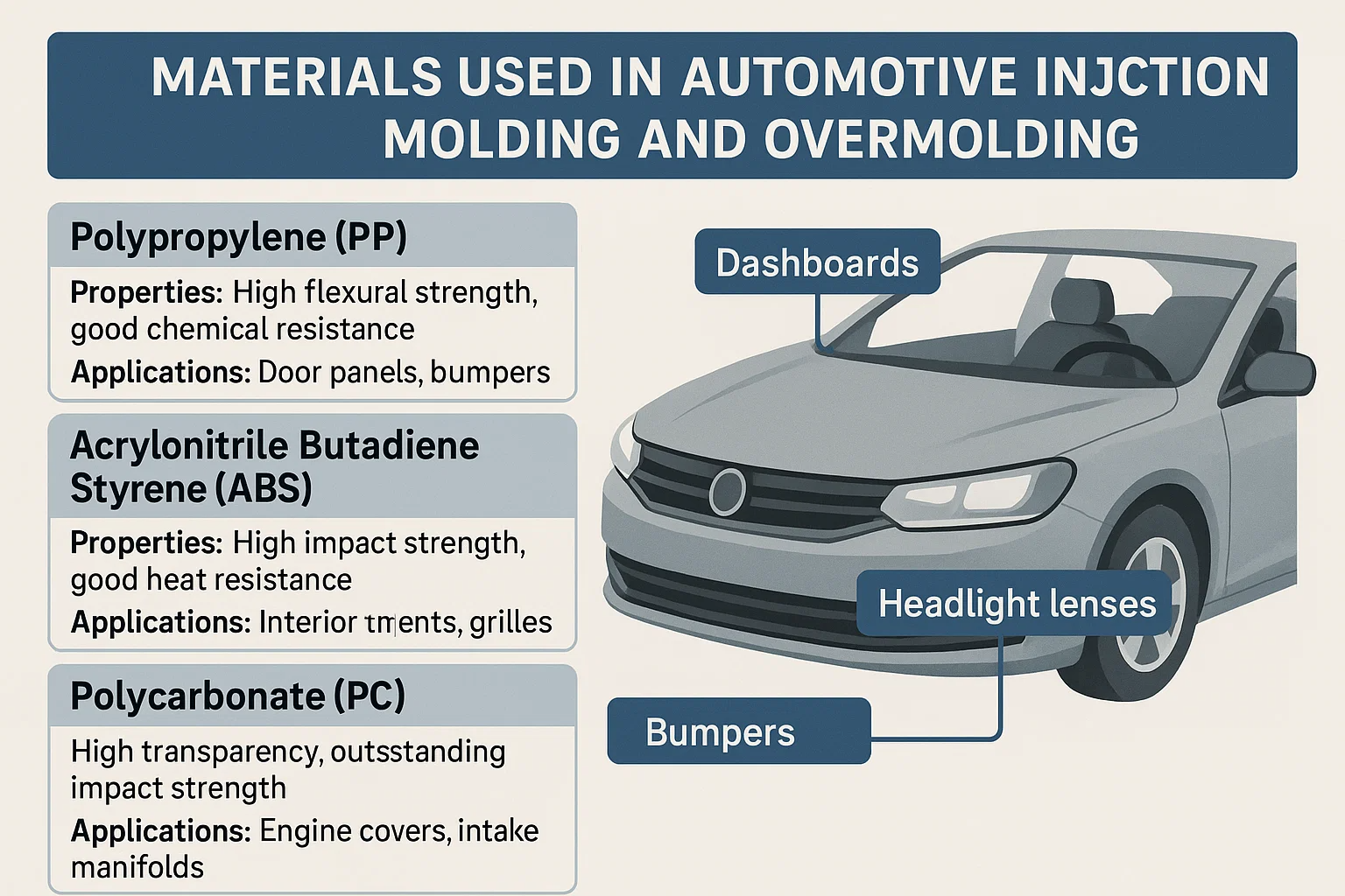 Polypropylène (Pp): Un plastique léger et à faible coût avec une excellente résistance chimique, ce qui le rend idéal pour les applications sous le capot et intérieures.