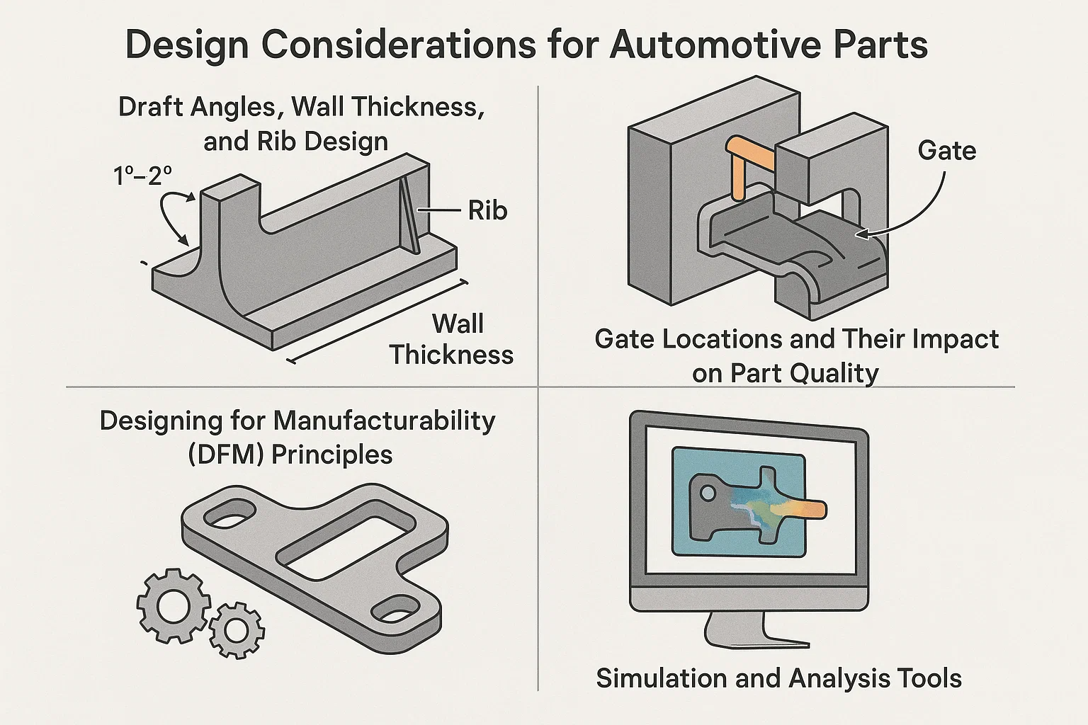 Le succès des pièces automobiles moulées et surmouillées injectables repose sur un processus de conception méticuleux. Une pièce bien conçue est non seulement fonctionnelle mais aussi fabriquée, durable et rentable. L'adhésion aux principes de conception fondamentale est crucial pour éviter les problèmes communs comme la déformation, les obligations faibles et les défauts cosmétiques.