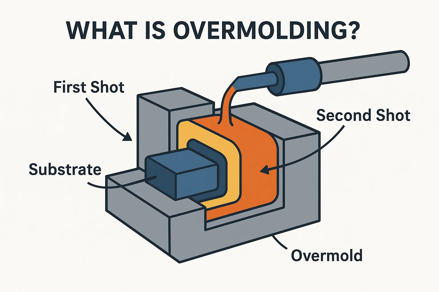 Overmolding est un processus séquentiel en deux étapes où le deuxième matériau est moulé sur une pièce solide et préexistante. Ceci est idéal pour ajouter une couche douce à une base rigide.