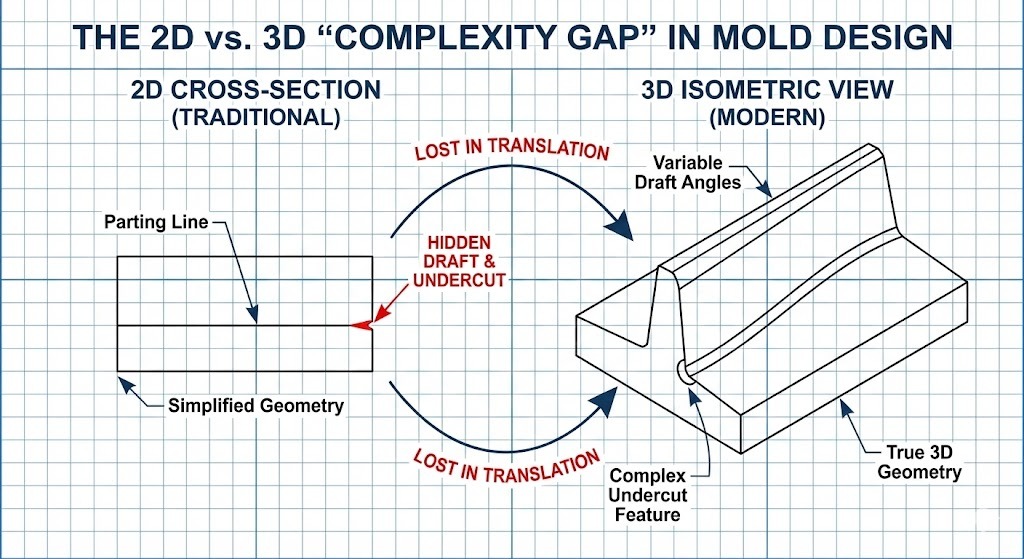 Tandis que conception de moule Les fondamentaux ont été construits sur le dessin 2D, la demande croissante de produits « organiques » et hautes performances a mis en évidence les limites de la pensée planaire. Dans un marché concurrentiel, le fait de s'appuyer sur des flux de travail traditionnels centrés sur la 2D crée un « plafond de complexité » qui entrave l'innovation et gonfle les coûts.