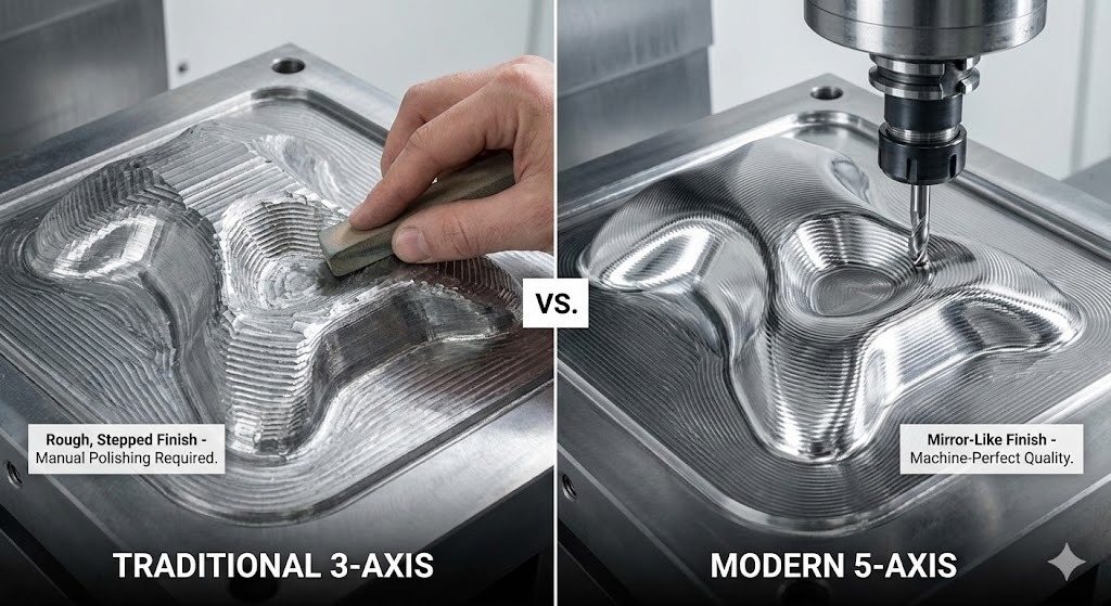 Sur une machine à 3 axes, la découpe d'une surface courbe entraîne une « marche en escalier ». Pour résoudre ce problème, les travailleurs doivent passer des heures mise au banc manuelle (polissage). Une machine 5 axes incline l'outil pour maintenir une constante Hauteur de la cuspide (ou hauteur de pétoncle), ce qui donne une surface si lisse qu'elle ne nécessite souvent aucun post-traitement.