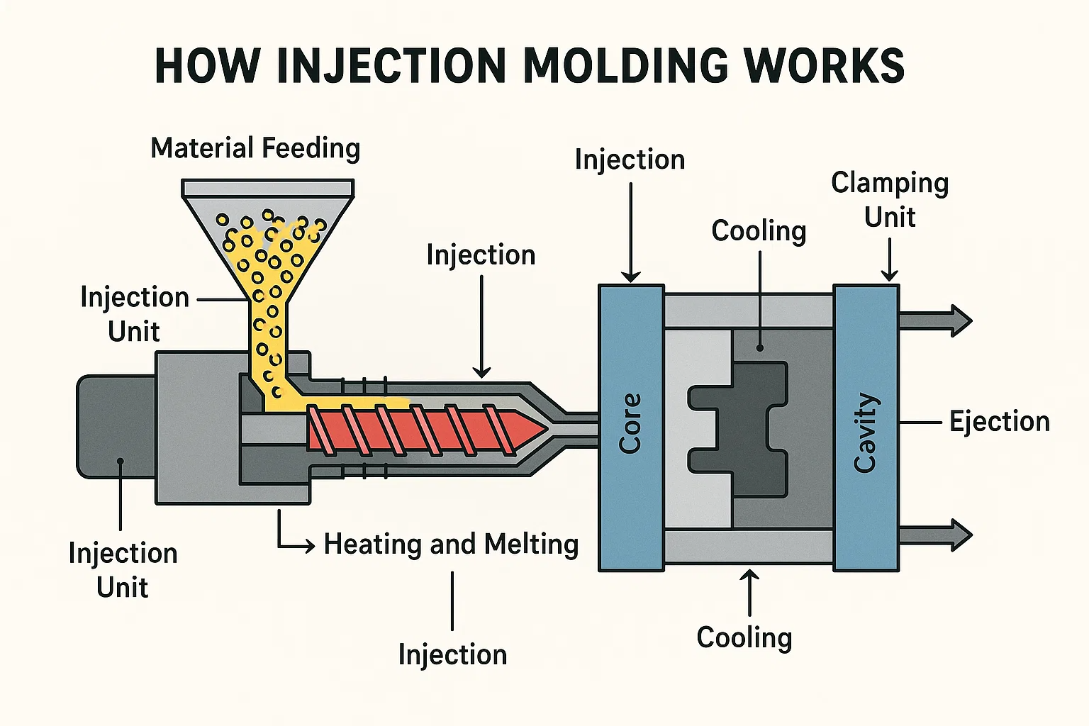 Au cœur de presque toute la fabrication de kit de modèle en plastique moderne se trouve un processus sophistiqué appelé moulage par injection (tolérances mesurées en microns) . Cette technique est la pierre angulaire des pièces en plastique identiques productrices de masse à haute précision et efficacité, ce qui le rend idéal pour les composants complexes trouvés dans les kits de modèle. Avant de nous plonger dans les spécificités de la création de moisissures, il est crucial de saisir les principes fondamentaux du fonctionnement du moulage par injection, car le moule lui-même est conçu spécifiquement pour fonctionner dans ce processus.
